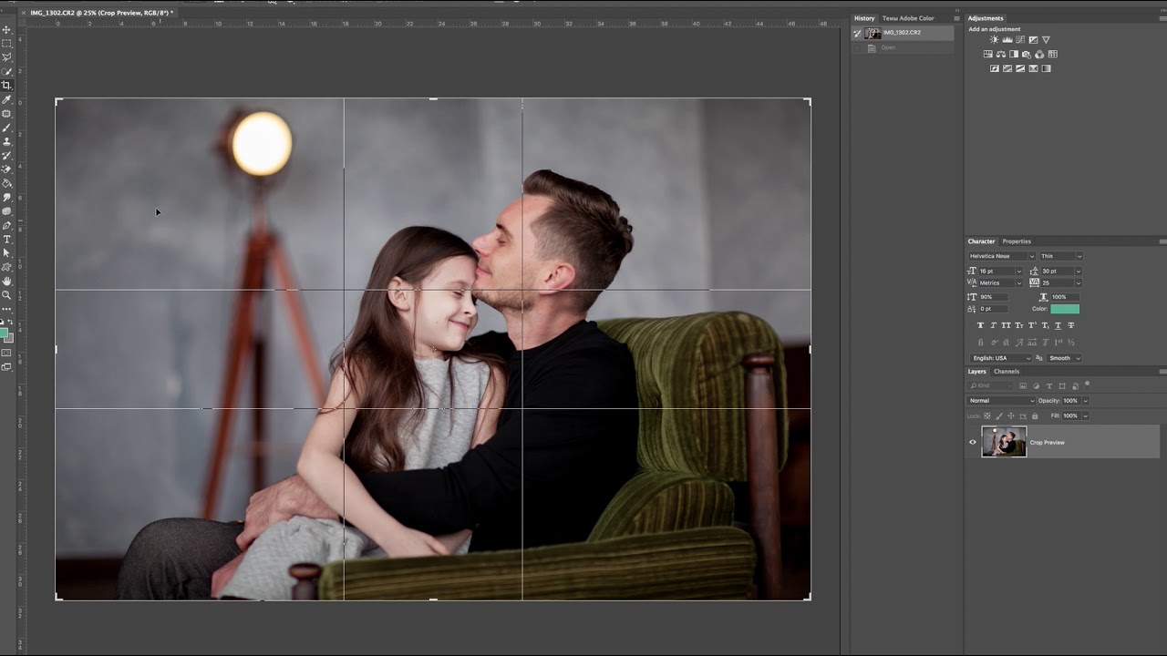 Заглянем с вами в один из этапов обработки - кадрирование и посмотрим, что же нам предлагает Photoshop для решения композиционных задач. Оказывается, мы можем менять сеточки. Хотим - выбираем упрощённый вариант, а хотим - выбираем классический вариант золотого сечения.
